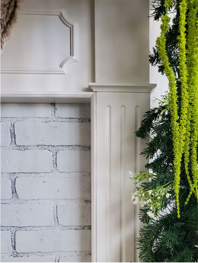 Once the paint on the brick dried I placed the HDF panel against the wall behind the mantel. I did not attach the panel to the wall nor did I attach it to the mantel. You can attach the panel to either if you plan on making your fireplace a permanent structure. At this point I used my brad nailer to attach the scribe molding to the inside edges of my mantel to hide any gaps between the mantel and the brick panel.