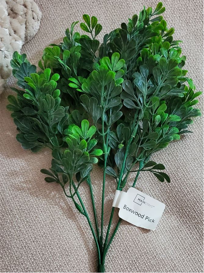 I found two Amaranthus picks and eleven Boxwood picks. It does looks great as is but if I find more Amaranthus and Baby’s breaths picks I’ll use more for an even fuller look.