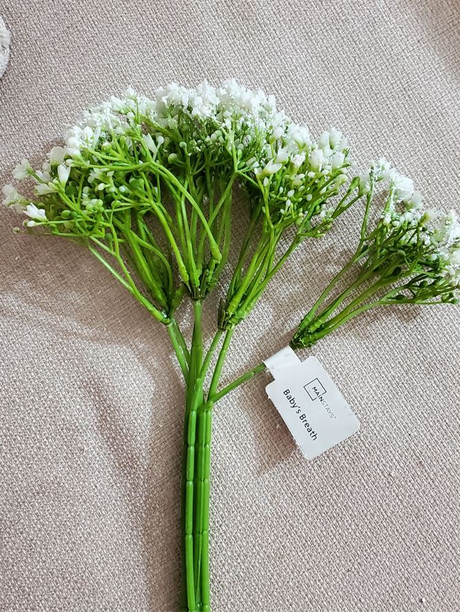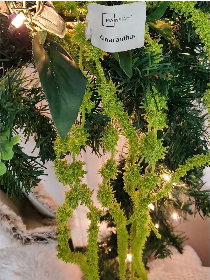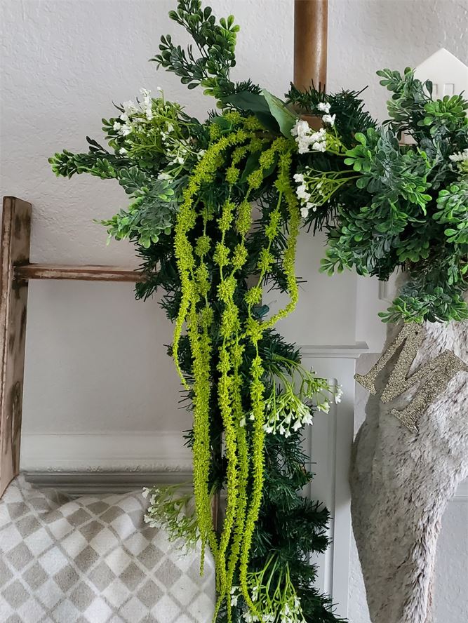 I fluffed the Boxwood picks in between the base garland but kept the pick in tack as well as the Amaranthus picks. The Baby’s breath picks I did pull apart from the pick and scattered the pieces through out the garland. You can keep the Baby’s breath pick in tacked if you prefer. I only found two Baby’s breath picks so I had to pull mine apart.