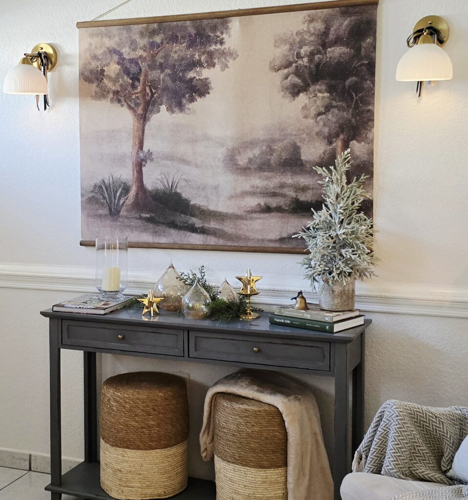 - A touch of holiday accent on the console (candle, vase, small arrangement)